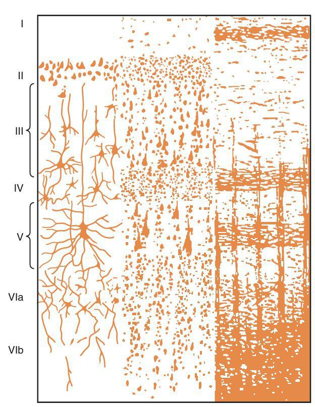 Structure of the cerebral cortex, showing the following layers: I, molecular layer; II, external granular layer; III, layer of pyram idal cells; IV, internal granular layer; V, large pyramidal cell layer; and VI, layer of fusiform or polymorphic cells. (Modified