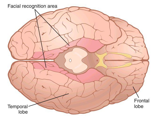 Facial recognition areas located on the underside of the brain in the medial occipital and temporal lobes