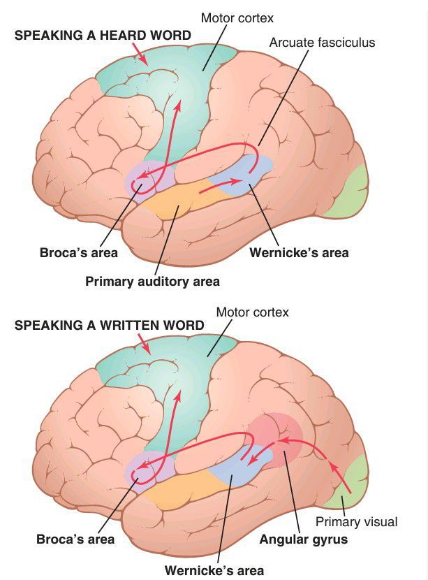 Brain pathways for (top) perceiving a heard word and then speaking the same word and (bottom) perceiving a written word and then speaking the same word. (Mo