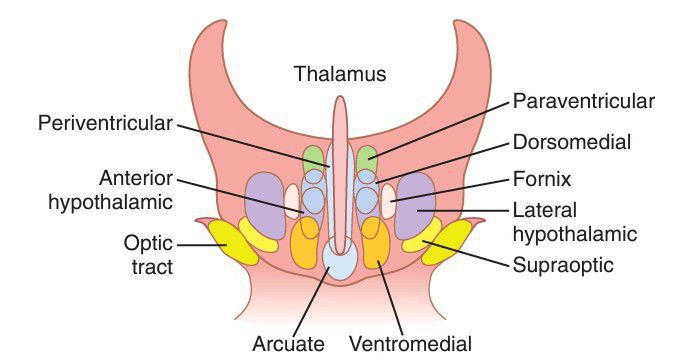 Coronal view of the hypothalamus, showing the mediolateral positions of the respective hypothalamic nuclei.