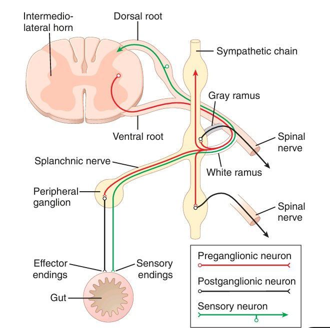 Nerve connections among the spinal cord, spinal nerves, sympathetic chain, and peripheral sympathetic nerves.