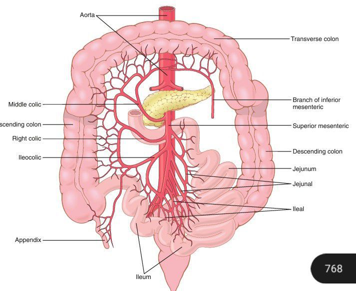 Figure shows the general features of the arterial blood supply to the gut, including the superior mesenteric and inferior mesenteric arteries supplying the walls of the small and large intestines by way of an arching arterial system. Not shown in the figure is the celiac artery, which provides a similar blood supply to the stomach.
