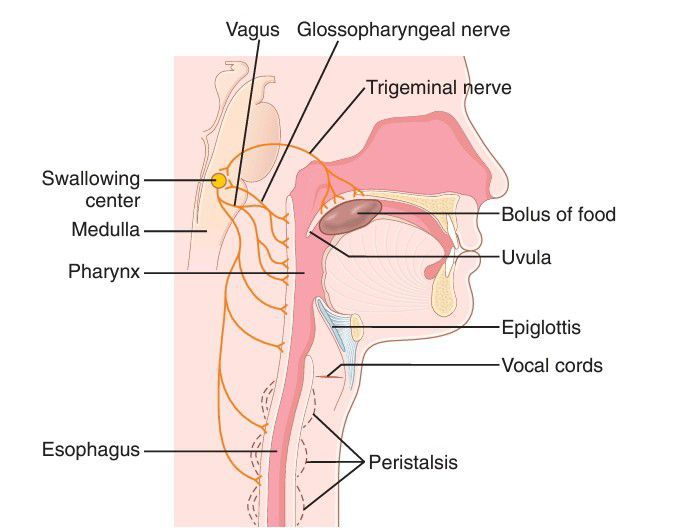 When the food is ready for swallowing, it is “voluntarily” squeezed or rolled posteriorly into the pharynx by pressure of the tongue upward and backward against the palate, as shown in Figure. From here on, swallowing becomes entirely—or almost entirely—automatic and ordinarily cannot be stopped.
