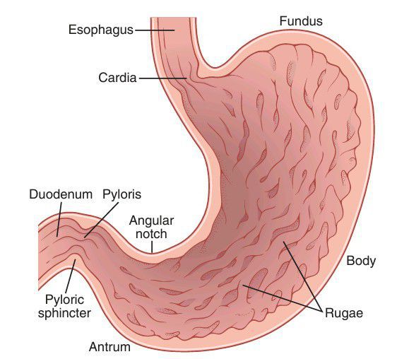 Figure shows the basic anatomy of the stomach. Anatomically, the stomach is usually divided into two major parts: (1) the body and (2) the antrum. Physiologically, it is more appropriately divided into (1) the “orad” portion, comprising about the first two thirds of the body, and (2) the “caudad” portion, comprising the remainder of the body plus the antrum.