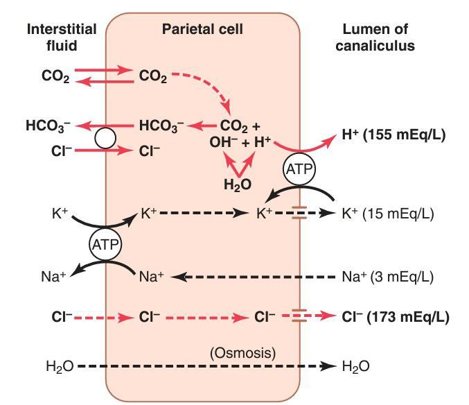 Postulated mechanism for secretion of hydrochloric acid. (The points labeled “ATP” indicate active pumps, and the dashed lines represent free diffusion and osmosis