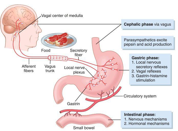 Gastric secretion is said to occur in three “phases” (as shown in Figure 65-7): a cephalic phase, a gastric phase, and an intestinal phase.