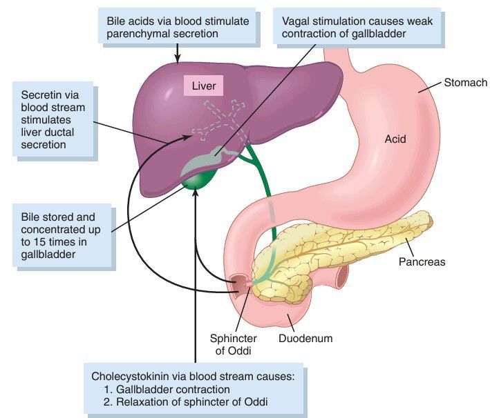 When bile finally reaches the hepatic duct and common bile duct , From these ducts the bile either empties directly into the duodenum or is diverted for minutes up to several hours through the cystic duct into the gallbladder.