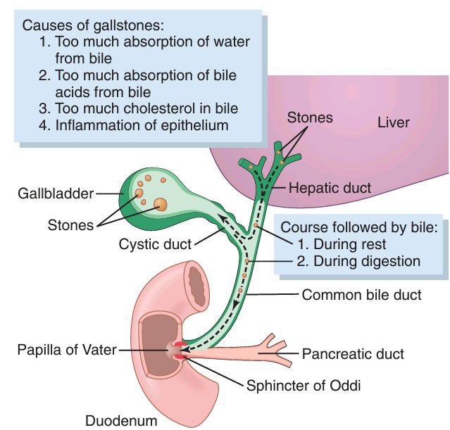 Under abnormal conditions, the cholesterol may precipitate in the gallbladder, resulting in the formation of cholesterol gallstones, as shown in figure.