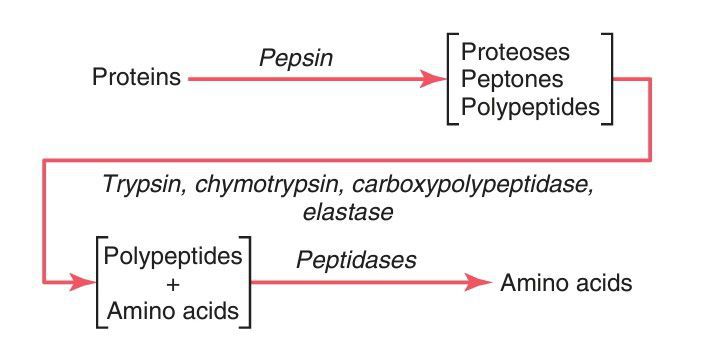 As shown in Figure, pepsin only initiates the process of protein digestion, usually providing only 10 to 20 percent of the total protein digestion to convert the protein to proteoses, peptones, and a few polypeptides. T his splitting of proteins occurs as a result of hydrolysis at the peptide linkages between amino acids