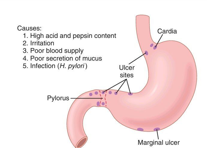 Figure shows the points in the gastrointestinal tract at which peptic ulcers most frequently occur, demonstrating that the most frequent site is within a few centimeters of the pylorus.