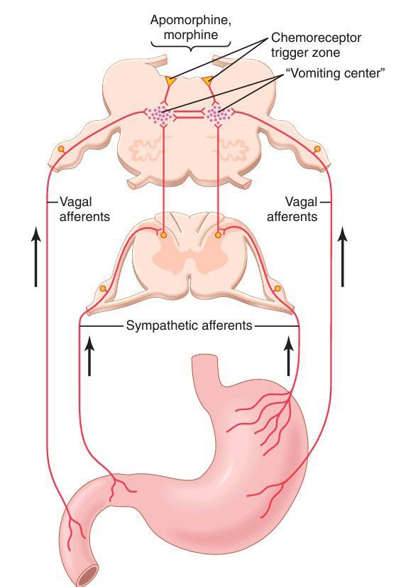 As shown in Figure, the nerve impulses are transmitted by both vagal and sym pathetic afferent nerve fibers to multiple distributed nuclei in the brain stem, especially the area postrema, that all together are called the “vomiting center.”