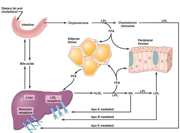 Summary of major pathways for metabolism of chylomicrons synthesized in the intestine and very low density lipoprotein (VLDL) synthesized in the liver. Apo B, apolipoprotein B; Apo E, apolipoprotein E; FFA, free fatty acids; IDL, intermediate-density lipoprotein; LDL, low-density lipoprotein; LPL, lipoprotein lipase.