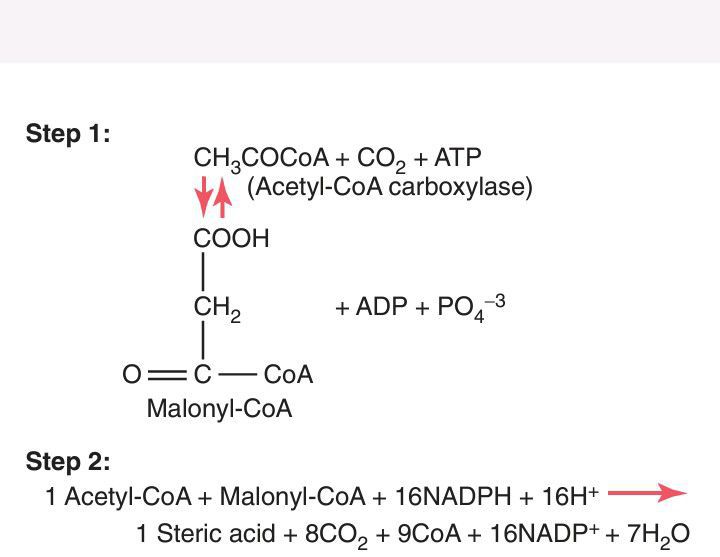 This occurs by the two-step process shown in Figure ,using malonyl-CoA and reduced nicotinamide adenine dinucleotide phosphate (NADPH) as the principal intermediates in the polymerization process.