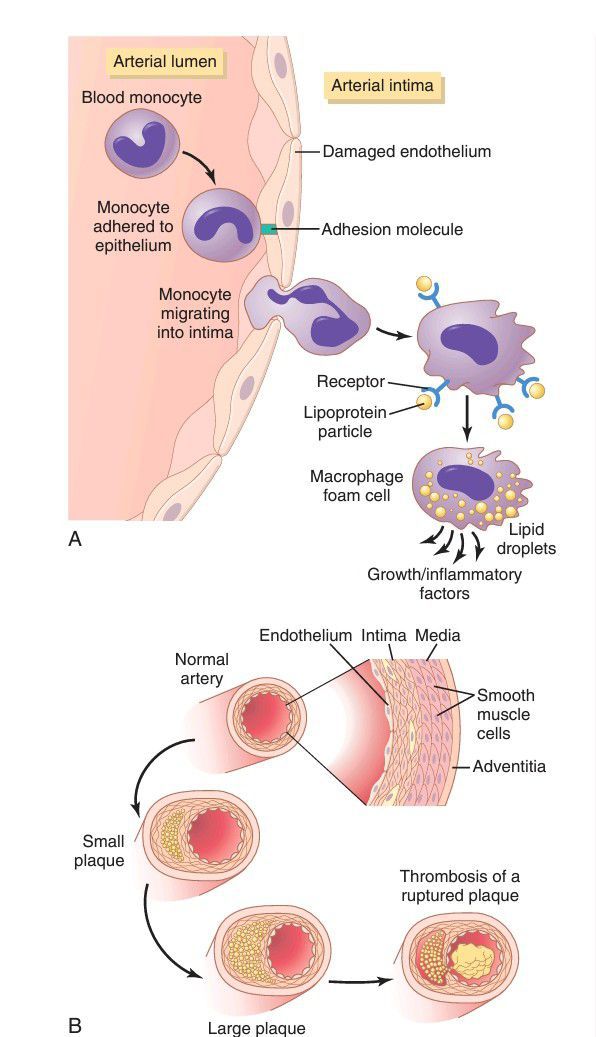 . A, Attachment of a monocyte to an adhesion molecule on a damaged endothelial cell of an artery. The monocyte then migrates through the endothelium into the intimal layer of the arterial wall and is transformed into a macrophage. The macrophage then ingests and oxidizes lipoprotein molecules, becoming a macrophage foam cell. The foam cells release substances that cause inflammation and growth of the intimal layer. B, Additional accumulation of macrophages and growth of the intima cause the plaque to grow larger and accumulate lipids. Eventually, the plaque may occlude the vessel or rupture, causing the blood in the artery to coagulate and form a thrombus. (Modified from Libby P: Inflammation in ather