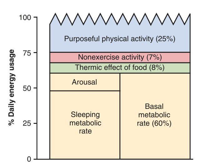 Even when a person is at complete rest, considerable energy is required to perform all the chemical reactions of the body. This minimum level of energy required to exist is called the basal metabolic rate (BMR) and accounts for about 50 to 70 percent of the daily energy expenditure in most sedentary persons