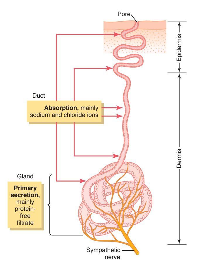 Sweat gland innervated by an acetylcholine-secreting sympathetic nerve. A primary protein-free secretion is formed by the glandular portion, but most of the electrolytes are reabsorbed in the duct, leaving a dilute, watery secretion.