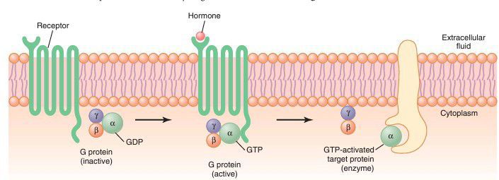 When the hormone activates the receptor, the inactive α, β, and γ G protein complex associates with the receptor and is activated, with an exchange of guanosine triphosphate (GTP) for guanosine diphosphate (GDP). This process causes the α subunit (to which the GTP is bound) to dissociate from the β and γ subunits of the G protein and to interact with membrane-bound target proteins (enzymes) that initiate intracellular signals.