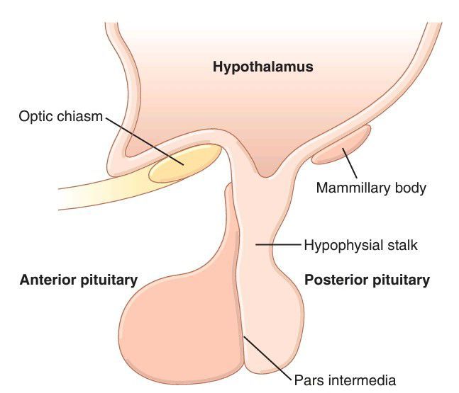T he pituitary gland also called the hypophysis, is a small gland—about 1 centimeter in diameter and 0.5 to 1 gram in weight—that lies in the sella turcica, a bony cavity at the base of the brain, and is connected to the hypothalamus by the pituitary (or hypophysial) stalk. Physiologically, the pituitary gland is divisible into two distinct portions: the anterior pituitary, also known as the adenohypophysis, and the posterior pituitary, also known as the neurohypophysis. Between these portions is a small, relatively avascular zone called the pars intermedia, which is much less developed in the human being but is larger and much more functional in some animals.
