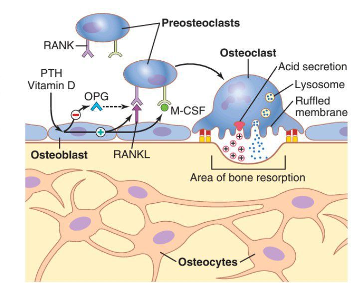 Parathyroid hormone (PTH) binds to receptors on osteoblasts, causing them to form receptor activator for nuclear factor κ-B ligand (RANKL) and to release macrophage-colony stimulating factor (M-CSF). RANKL binds to RANK and M-CSF binds to its receptors on preosteoclast cells, causing them to differentiate into mature osteoclasts. PTH also decreases production of osteoprotegerin (OPG), which inhibits differentiation of preosteoclasts into mature osteoclasts by binding to RANKL and preventing it from interacting with its receptor on preosteoclasts. The mature osteoclasts develop a ruffled border and release enzymes from lysosomes, as well as acids that promote bone resorption. Osteocytes are osteoblasts that have become encased in bone matrix during bone tissue production; the osteocytes form a system of interconnected cells that spreads all th