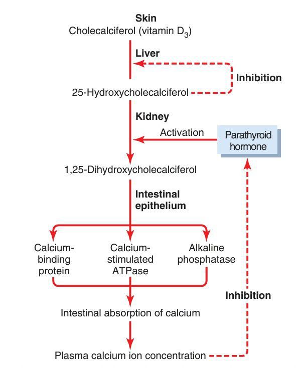 Figure shows the succession of steps that lead to the formation of 1,25dihydroxycholecalciferol, substance from vitamin D.