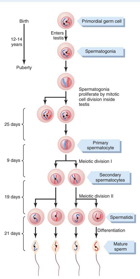During embryonic development, the primordial germ cells migrate to the testis, where they become spermatogonia. At puberty (usually 12 to 14 years after birth), the spermatogonia proliferate rapidly by mitosis. Some begin meiosis to become primary spermatocytes and continue through meiotic division I to become secondary spermatocytes. After completion of meiotic division II, the secondary spermatocytes produce spermatids, which differentiate to form spermatozoa.