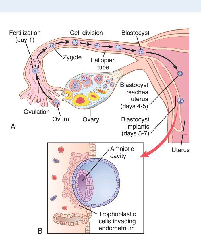 A, Ovulation, fertilization of the ovum in the fallopian tube, and implantation of the blastocyst in the uterus. B, The action of trophoblast cells in implantation of the blastocyst in the uterine endometrium.