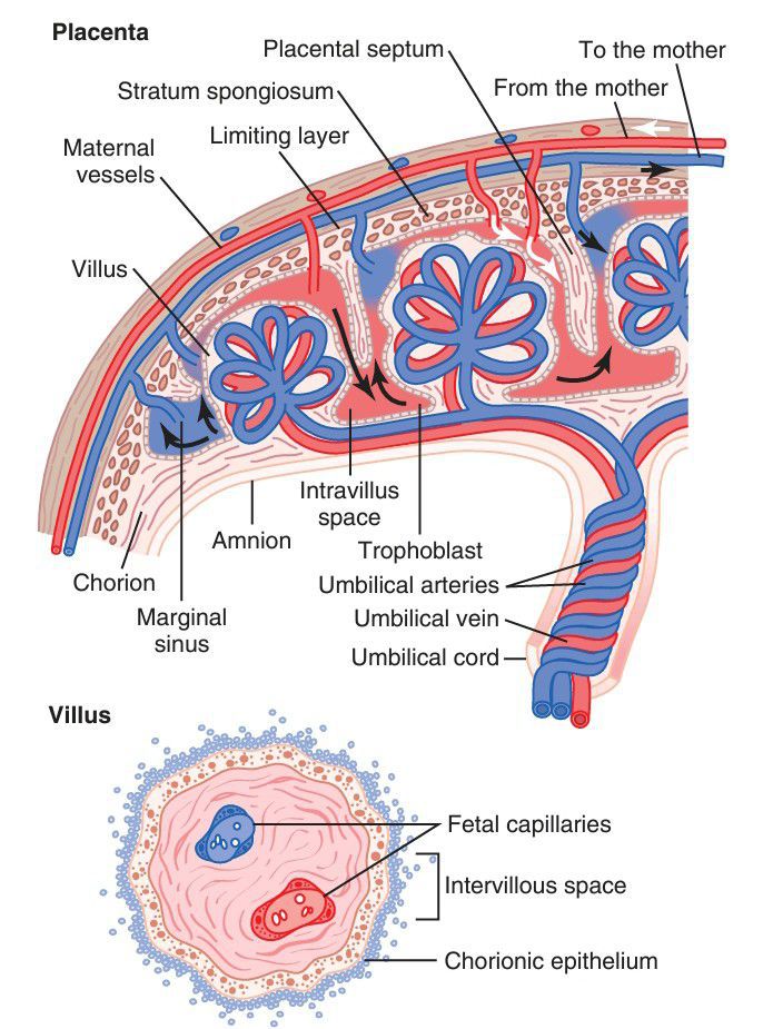 Top, Organization of the mature placenta. Bottom, Relation of the fetal blood in the villus capillaries to the mother’s blood in the intervillous spaces.