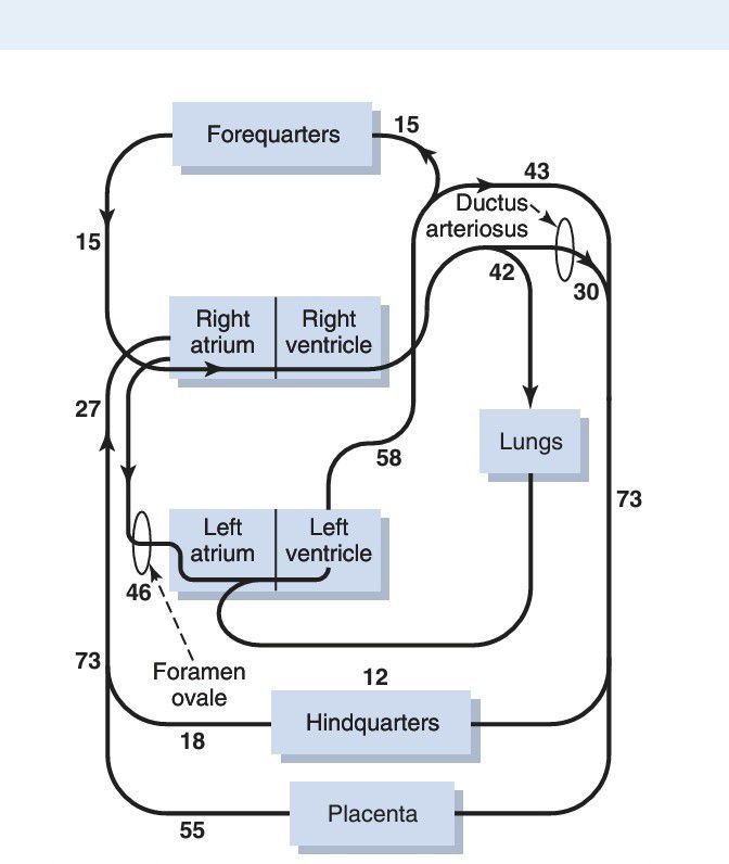 Diagram of the fetal circulatory system, showing relative distribution of blood flow to the different vascular areas. The numerals represent the percentage of the total output from both sides of the heart flowing through each particular area