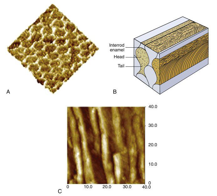 Enamel microstructure showing a schematic diagram of keyhole-shaped enamel prisms or rods about 5 μm in diameter (B). Atomic force microscopy (AFM) images showing prism cross sections in A and along axes of the prisms in C. Crystallite orientation deviates in the inter-rod and tail area, and the organic content increases in the inter-rod area. (Modified from Habelitz S, et al: Arch. Oral Biol. 46, 173-183, 2001.)