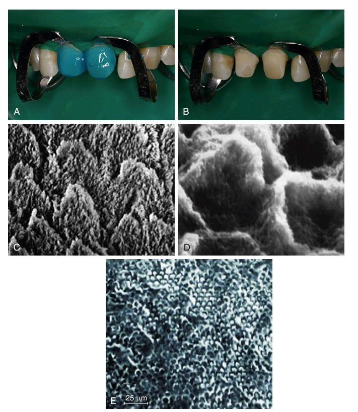 A, Gel etchant dispensed on the enamel portion of the preparation. B, Frosty appearance after etching, rinsing and drying. C, Magnified view of etch pattern with preferential prism periphery etch (type 1). D, Bonding agent revealed after dissolving enamel. E, Mixed etch patterns showing type 1 (light prisms with dark periphery) and type 2 (dark cores with light periphery) etching on same surface