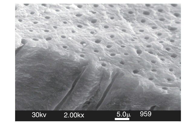 Scanning electron microscopy (SEM) image of normal dentin showing its unique structure as seen from two directions. At the top is a view of the tubules, each of which is surrounded by peritubular dentin. Tubules lie between the dentin-enamel junction (DEJ) and converge on the pulp chamber. The perpendicular surface at the bottom shows a fracture surface revealing some of the tubules as they form tunnel-like pathways toward the pulp. The tubule lumen normally contains fluid and processes of the odontoblastic cells. (From