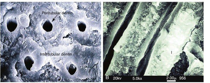 Fracture surface of the dentin viewed from the occlusal in A and longitudinally in B. Peritubular (P) (also called intratubular) dentin forms a cuff or lining around each tubule. The tubules are separated from one another by intertubular dentin (I). (Cour