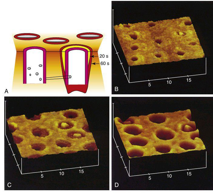 A, Schematic showing progressive stages of dentin demineralization. B to D, Atomic force microscopy (AFM) images showing stages of etching. The etching leads to wider lumens as peritubular dentin is dissolved and funnel-shaped openings are formed. (A