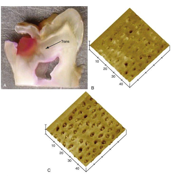 . A, Carious lesion showing dentin carious zones revealed by staining, including the grayish transparent zone. B, Atomic force microscopy (AFM) of carious transparent dentin before etching. C, After etching the tubule lumens remain filled even as the peritubular dentin is etched away. (A from Zheng L, et al: Eur. J. Oral
