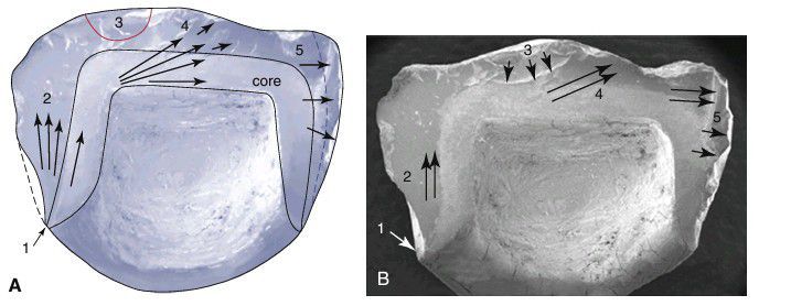 . Sketched illustration of the stereo findings (A) as well as a summary image of SEM mapping the general direction of crack propagation of the recovered broken Procera AllCeram crown part (B). (From Scherrer SS, et al: Dent. Mater. 24, 1107-1113, 2