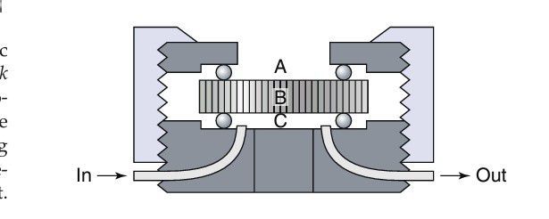 A dentin disk is used as a barrier in cytotoxicity tests that attempt to predict the toxicity of materials placed on dentin in vivo. The material is placed on one side (A) of the dentin disk (B) in the device used to hold the dentin disk. Collection fluid (cell culture medium or saline) is on the other side of the disk (C). Cells can also be grown on the collection side. Components of the material may diffuse through the dentin and the effect of the medium on cell metabolism can then be measured. To assess the rate of diffusion, the collection fluid can be circulated into and out of the collection chamber (C).