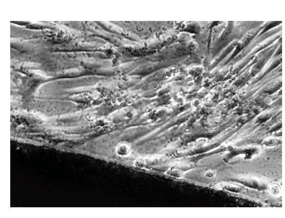 . Light microscopic view of a noncytotoxic interaction between a material (dark image at bottom of the picture) and periodontal ligament fibroblasts in a cell culture (in vitro) test. The morphology of the f ibroblasts indicates that they are alive and are not suffering from a toxic response (see Figure 6-3 for contrast). The material in this case was a calcium hydroxide pulp-capping agen