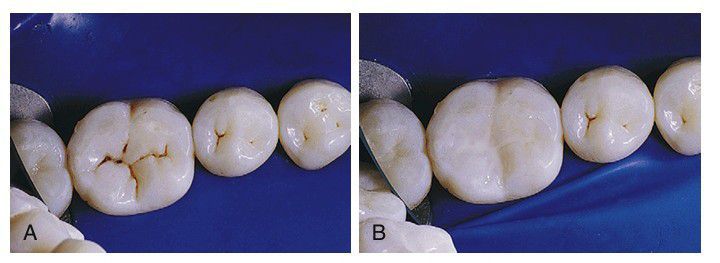 A, Before sealing, and B, after sealing with a natural-colored sealant material. (From Hatrick CD, Eakle WS, Bird WF: Dental materials: clinical applications for dental assistants and dental hygienists, ed 2, Sau