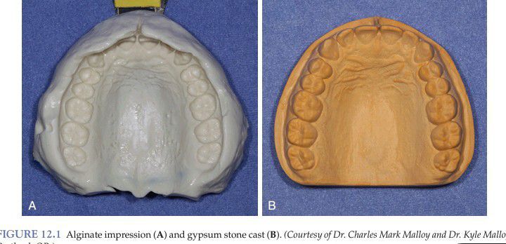 Alginate impression (A) and gypsum stone cast (B). (Courtesy of Dr. Charles Mark Malloy and Dr. Kyle Malloy, Portland, OR.)