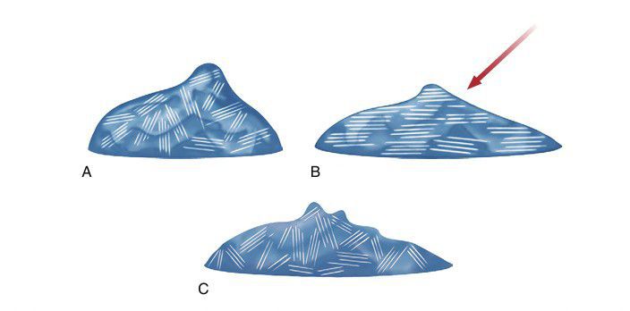 Demonstration of the mechanism for the property of shear thinning or pseudoplasticity in polyethers. The trigliceride network, A, within the impression material aligns when sheared as with syringing, and B, to achieve a lower viscosity. Once the shear force is removed, the viscosity increases with randomization of the triglyceride network, C.