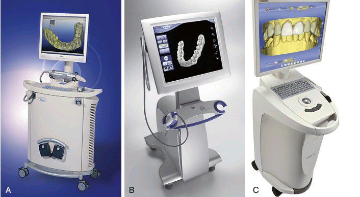 . A, iTero. B, Lava Chairside Oral Scanner C.O.S. C, CEREC AC. (A, Courtesy of Cadent, Inc., Carlstadt, NJ; B, Courtesy of 3M ESPE, St. Paul, MN; C, Courtesy of Sirona, Charlotte, NC.)