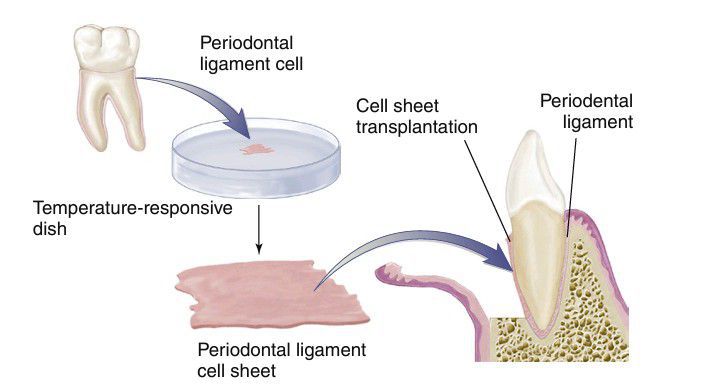 One method of periodontal ligament engineering under development. Periodontal cells are extracted from a patient’s tooth and grown on temperature responsive culture plates in vitro. Upon lowering the temperature on these cultures, the confluent layer of cells spontaneously lifts off of the plate as a sheet of cells with intact cell junctions. These sheets are then implanted with various treatments to attempt regeneration of the periodontal tissues. (Modified from Yamato M, Okano T: Mater. Today. 7, 42, 2004.)