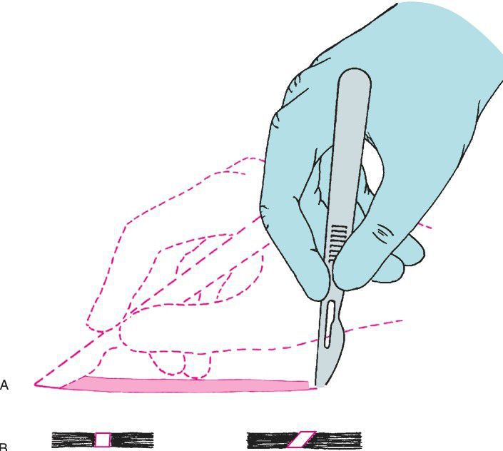 Proper method of making incision using No. 15 scalpel blade. Note the scalpel motion is made by moving the hand at the wrist and not by moving the entire forearm. (B) When creating a tissue layer that is to be sutured closed, the blade should be kept perpendicular to the tissue surface to create squared wound edges. Holding the blade at any angle other than 90 degrees to the tissue surface creates an oblique cut that is difficult to close properly and compromises blood supply to the wound edge. (Modif ied from Clark HB Jr. Practical Oral Surgery. 3rd ed. Philadelphia: Lea & Febiger; 1965
