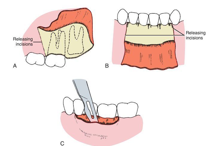 . (A) Horizontal and single vertical incisions used to create a two-sided flap. (B) Horizontal and two vertical incisions used to create a three-sided f lap. (C) Single horizontal incision used to create a single-sided (envelope) flap.