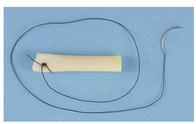 This Penrose drain is made of f lexible, rubberized material that can be placed into wound during closure, or after incision and drainage of abscess, to prevent premature sealing of wound before blood or pus collections can drain to the surface. Draining material runs along and through the drain. In this example, a suture has been tied to the drain and it is ready for insertion into the wound. The needled end of the suture will be used to attach the drain to the wound edge to hold it in place.