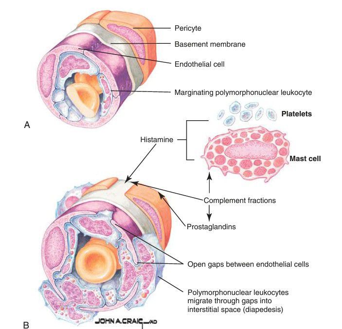 4.1 Early vascular responses to injury. Initial transient vasoconstriction (A) is soon followed by vasodilation (B). Vasodilation is caused by the actions of histamine, prostaglandins, and other vasodilatory substances. Dilation causes intercellular gaps to occur, which allows egress of plasma and emigration of leukocytes. (Netter illustration from w