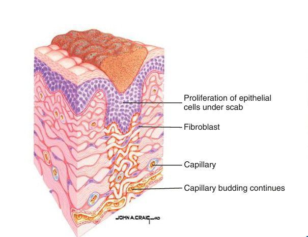 Proliferative phase of fibroplastic stage of wound repair. Proliferation increases epithelial thickness, collagen fibers are haphazardly laid down by fibroblasts, and budding capillaries begin to establish contact with their counterparts from other sites in wound. (Netter illustra