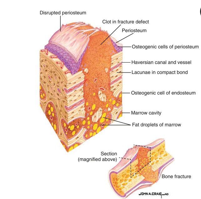 Early phase of fibroplastic stage of bone repair. Osteogenic cells from periosteum and marrow proliferate and differentiate into osteoblasts, osteoclasts, and chondroblasts, and capillary budding begins. (Netter illustration from www.netterimages.com. © Elsevier Inc. All righ