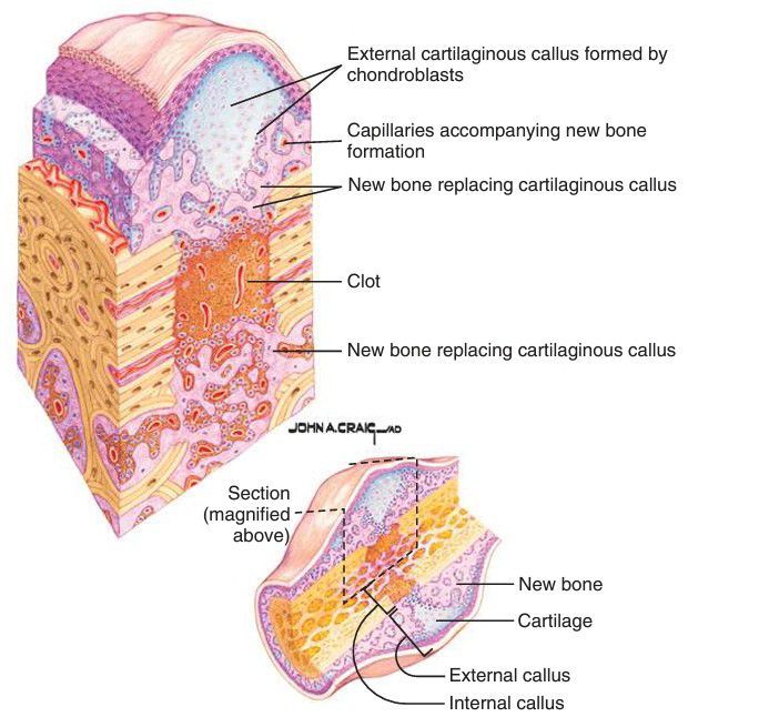 Late phase of fibroplastic stage of bone repair. Osteoclasts resorb necrotic bone. In areas of sufficient oxygen tension, osteoblasts lay down new bone; in areas of low oxygen tension, chondroblasts lay down cartilage. In addition, capillary ingrowth continues and internal and external calluses form. (Netter illustration from www.netterimages.com. © Elsevier Inc. All rights reserved