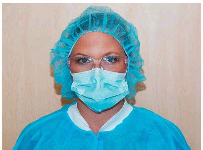 Surgeon ready for office oral surgery, wearing clean gown over street clothes, mask over nose and mouth, cap covering scalp hair, sterile gloves, and shatter-resistant eye protection. Nondangling earrings are acceptable in clean technique.